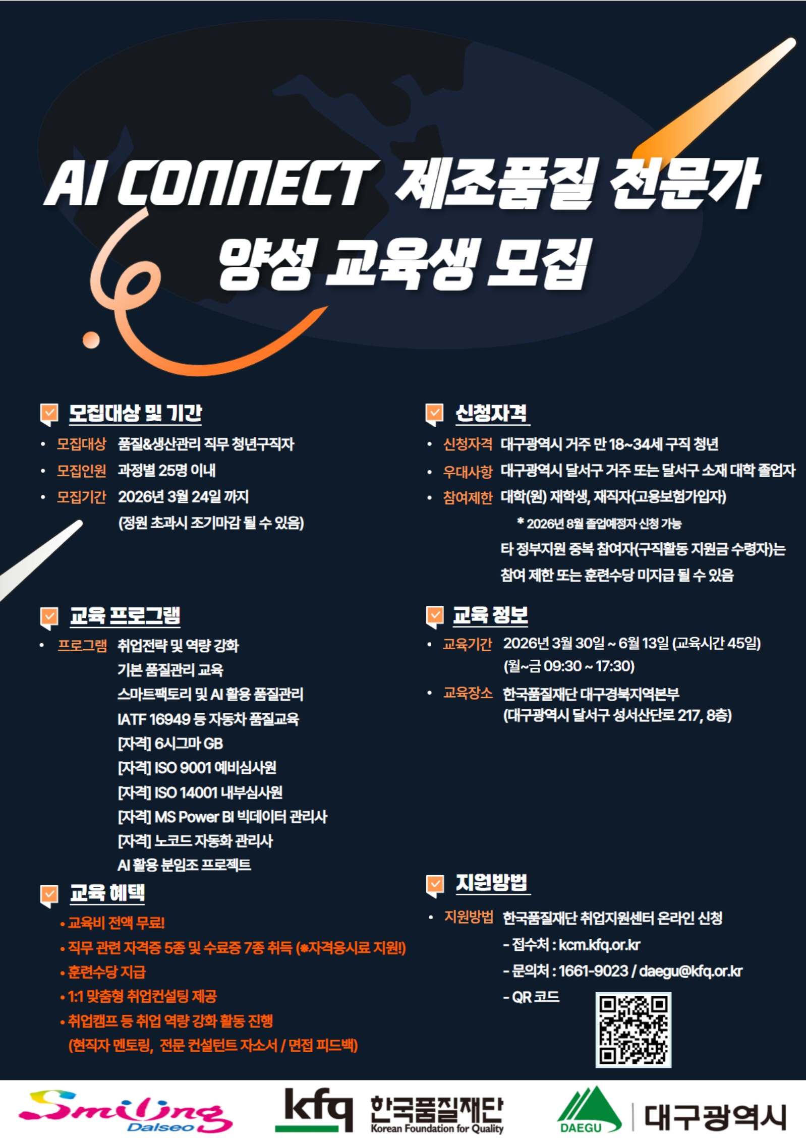 👉 URL. https://kcm.kfq.or.kr ->AI Connect 제조품질 전문가 양성 클릭 -> 이미지 클릭 -> 신청하기!